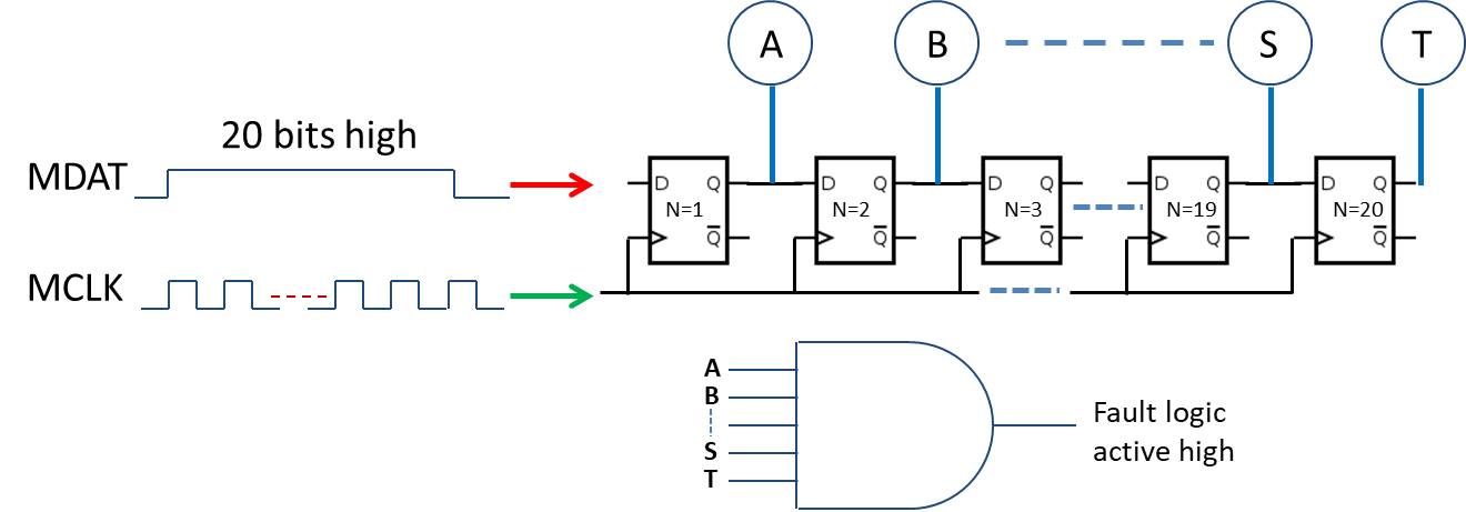 Fault detection logic can be easily implemented in an FPGA or microcontroller. One method is to implement an n-array of D-type flip-flops. The outputs of the array of flip-flops are connected to an AND gate for n-bits high detection and to a NOR gate for n-bits low detection. When the first bit of a stream of continuous high or low bits reaches the last flip-flop, the AND gate output turns logic high for continuous n-bits logic 1 (high). Similarly, the NOR gate output goes high when continuous n-bits logic 0 (low) are detected. This provides fault feedback to microcontroller.
