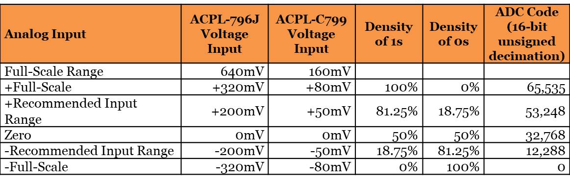 For the ACPL-796J, a further reduction of response time to sub-1µs can be achieved if the input voltage range of the sigma-delta modulator is optimised to ±50mV. When an over-current event occurs, the input voltage level goes beyond ±100mV which corresponds to 5b continuously high or low at the sigma-delta output.