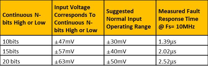 Table 2 shows various configurations of n-bit detection versus response time and the suggested normal operating input range.