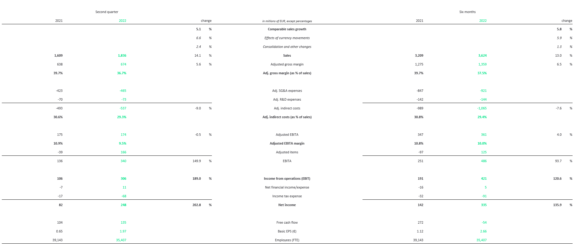 Sales increased by 14.1% to €1,836m, with a comparable sales growth of 5.1%, largely driven by continued strong professional demand across most markets except China, which was impacted by lockdowns during the quarter.