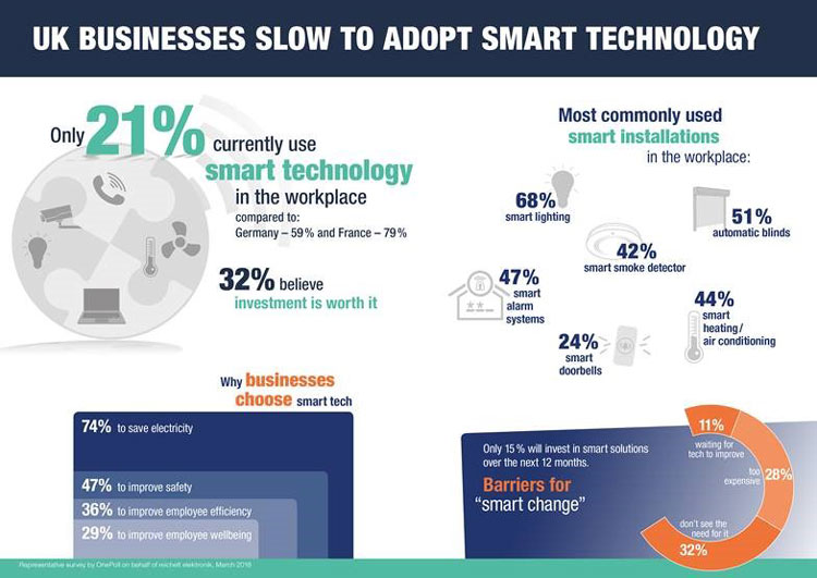 Online electrical retailer reichelt elektronik has found with new research, that uses for smart technology in the workplace are misunderstood or not valued, with over 50% saying they will not be investing in the next 12 months. Smart technology has now become mainstream in our homes but it is yet to make the transition to the workplace.
