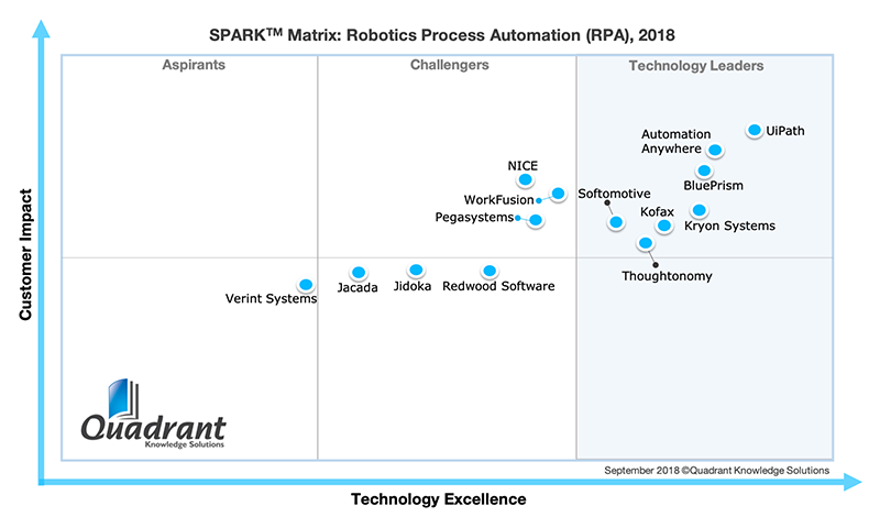 According to the Quadrant’s research findings, Softomotive is positioned amongst the technology leaders in the 2018 SPARK Matrix analysis of the global RPA market. Softomotive is amongst the early providers of automation solution and offers WinAutomation, the desktop version, and ProcessRobot, an enterprise-class RPA platform with capabilities including centralised robot management and control, advanced analytics, ROI dashboard, scalability, enhanced security, and artificial intelligence (AI) and machine learning (ML) through integration with best-in-class cognitive services, including Microsoft, Google, and IBM Watson and ABBYY FlexiCapture.
