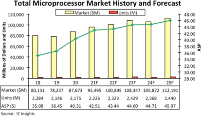 In the 2020-2025 forecast period, total microprocessor sales are projected to grow by a CAGR of 5.1% with the only annual decrease occurring in 2024 (-2%), which is expected to be a global economic slowdown year. Worldwide microprocessor unit growth is forecast to rise by a CAGR of 2.3% through 2025. It is expected that total MPU unit growth will be held back through the forecast period by flat unit shipment growth of cellphone application processors even as embedded processor shipments are forecast to enjoy annual double-digit percentage increases during this same time.
