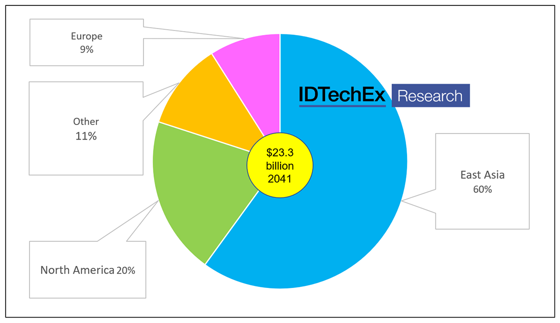 Value market for transparent and translucent electronics by territory 2041. 71% will be photovoltaics and displays. Source: IDTechEx, ‘Transparent Electronics Materials, Applications, Markets 2021-2041‘.