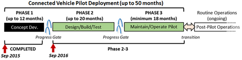 Figure 2. The DoT’s CV Pilots Deployment Program has selected Tampa, New York, and Wyoming as pilot sites. All have completed Phase 1 concept development activities and have entered Phase 2 – Design/Deploy/Test.