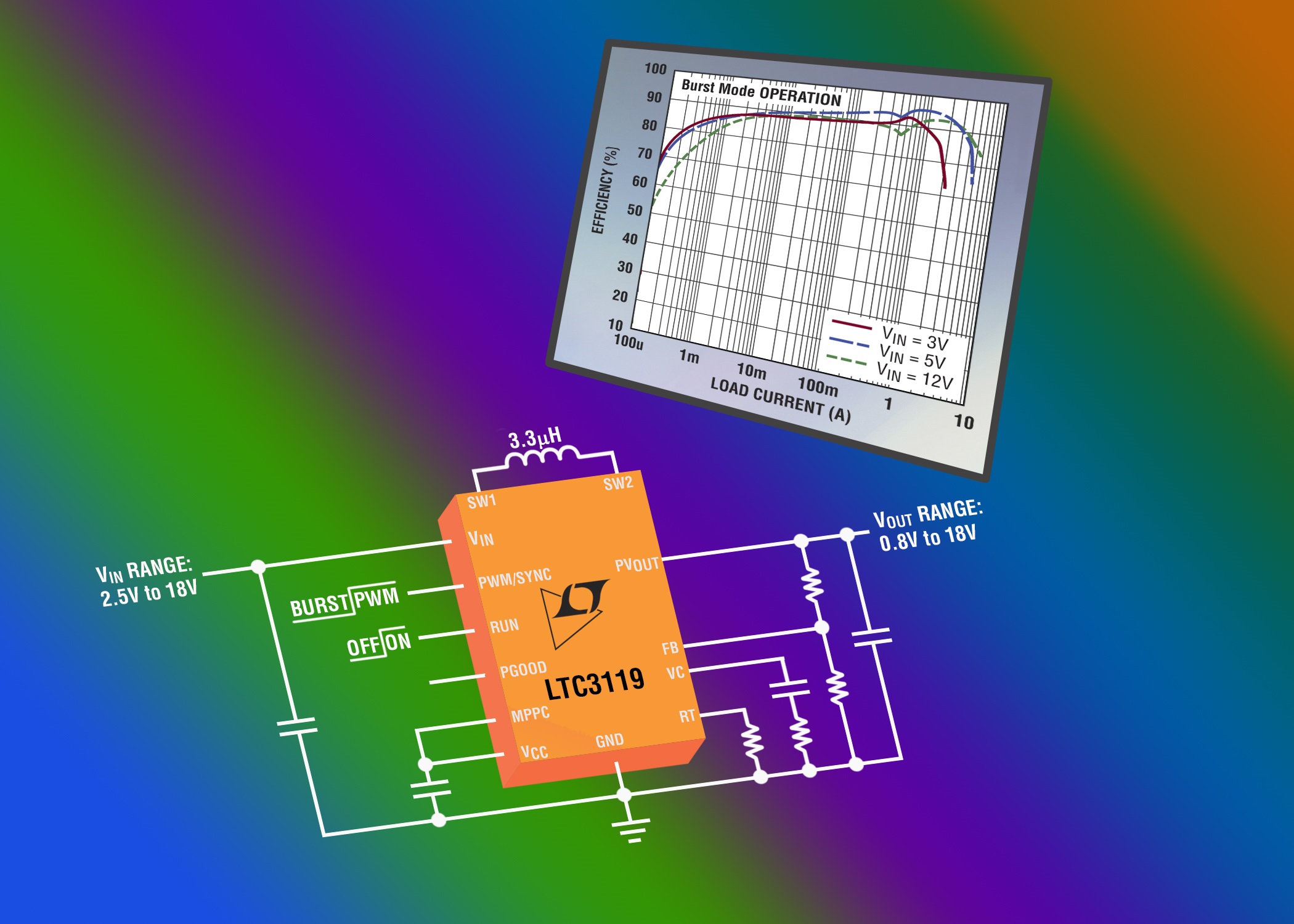 A power supply designer has to mitigate the risk involved with optimising a cumbersome solution like a SEPIC converter to generate a fixed output voltage when the input can be above, below, or even equal to the input. Optimising and integrating the power MOSFETs to facilitate a compact, efficient design simplifies the task. The LTC3119 is one option recently available from Analog Devices (see Figure 1). It is a synchronous current mode monolithic buck-boost converter that delivers up to 5A of continuous output current in buck mode from a variety of input sources, including single- or multiple-cell batteries, unregulated wall adapters as well as solar panels and supercapacitors. Higher output currents can be supported for pulsed load applications. The device’s 2.5 to 18V input voltage range extends down to 250mV once started. The output voltage is regulated with inputs above, below or equal to the output and is programmable from 0.8 to 18V. User-selectable Burst Mode operation lowers quiescent current to only 31μA, improving light load efficiency while extending battery runtime. The proprietary four-switch PWM buck-boost topology provides low noise, jitter-free switching through all operating modes, for RF and precision analogue applications that are sensitive to power supply noise. The device also includes programmable maximum power point control (MPPC) capability, ensuring maximum power delivery from power sources with higher output impedance including photovoltaic cells.