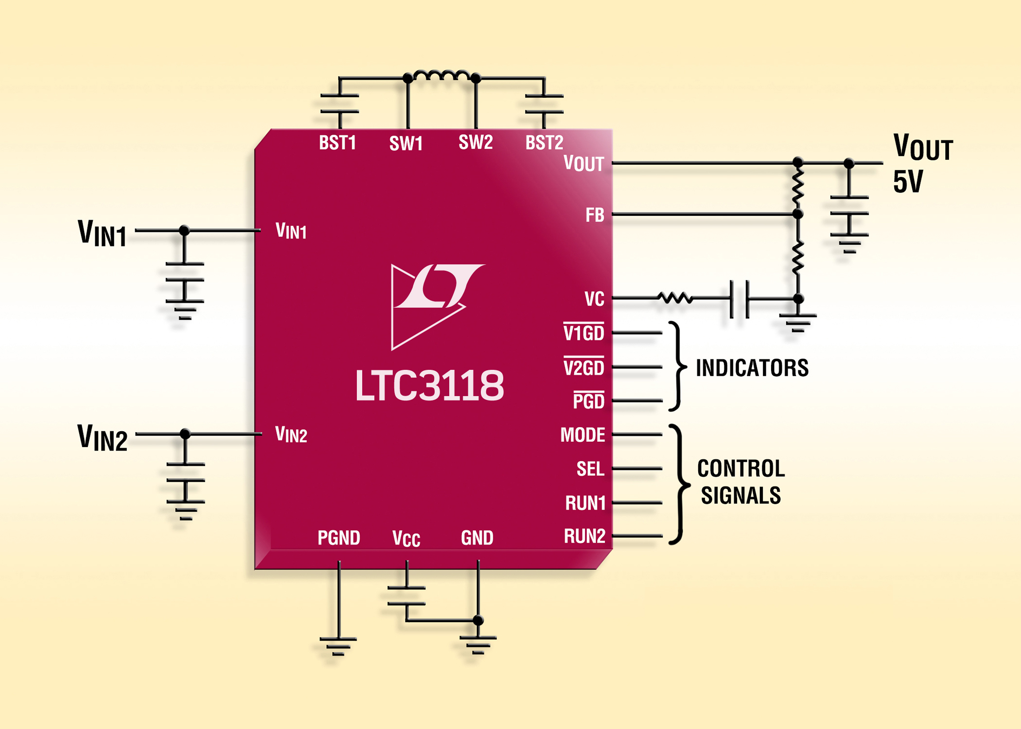 Many portable systems require being powered from multiple input sources including single or multi-call battery configurations, wall adapters and supercapacitor stacks. Another device in the same family is the LTC3118, a dual input, monolithic buck-boost with integrated lossless PowerPath which is capable of delivering up to 2A of continuous output current. It integrates the intelligence to automatically transition to the proper input source to seamlessly maintain a regulated output. Each input can operate from 2.2 to 18V, while the output can be programmed between 2.0 and 18V. A low noise, current mode buck-boost topology architecture has a fixed1.2MHz switching frequency for continuous, jitter-free transition between buck and boost modes, making it suitable for RF and other noise-sensitive applications. It has small externals and a 4.0 x 5.0mm QFN or TSSOP-28E package.