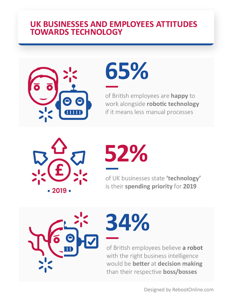 It is revealed that 65% of workers are willing to work alongside robotic technology, if it led to the reduction of manual processes. Additionally, 34% of British employees would consider a robot with the right business intelligence, to be better at decision making than their respective boss/bosses or senior management.