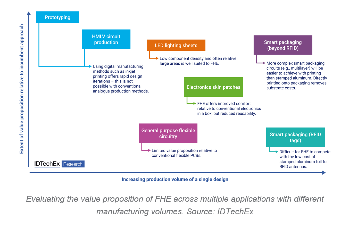 Relative to existing flexible PCBs, FHE offers 3 distinct value propositions: Additive digital manufacturing, conformality/stretchability, and compatibility with roll-to-roll (R2R) manufacturing. The key to successful commercialisation is finding a product-market fit where one or more of these value propositions either justifies switching or to facilitate a new application that would not otherwise be possible.
