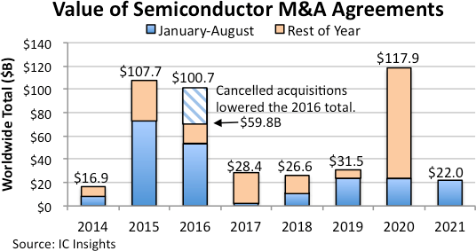 After a surge in semiconductor merger and acquisition announcements in the second half of 2020, the strong M&A momentum carried into the beginning of 2021, with purchase agreements for chip companies, business units, product lines, and related assets reaching a total value of $15.8 billion in 1Q21, setting a record-high level for the first quarter of a year. However, the pace of semiconductor acquisition agreements fell back over the next five months of 2021, putting this year’s total M&A value at $22.0 billion for the January-August timeperiod, according to IC Insights’ September Update of the 2021 McClean Report. The combined value of semiconductor M&A agreements announced in the first eight months of 2021 was slightly below the total for the same periods in 2019 and 2020 ($24.7 billion and $23.4 billion, respectively), as shown in the below table.