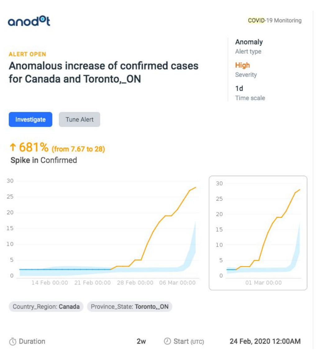 Anodot is running its algorithms based on publicly available data derived from The Center for Systems Science and Engineering (CSSE) at Johns Hopkins University.