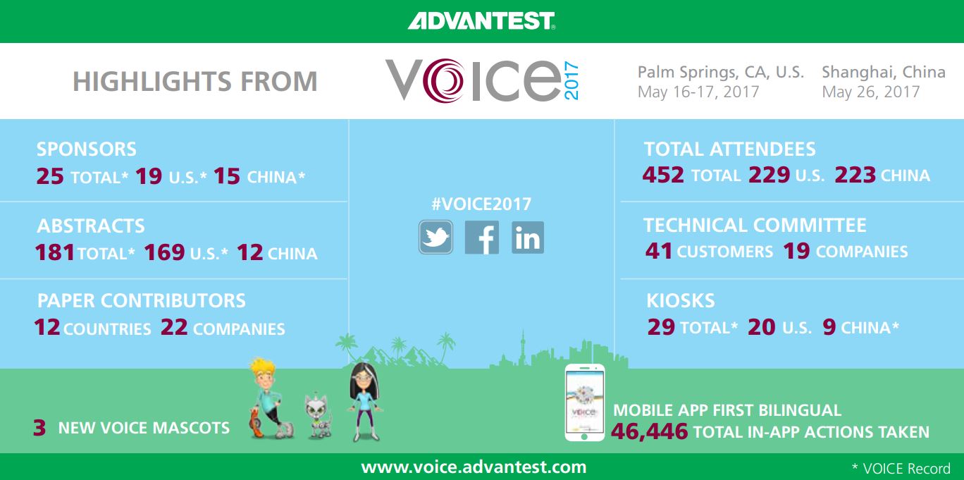 VOICE is made possible by the organisational work of a Steering Committee, made up of volunteer representatives from Advantest and its customers, and the support of event sponsors, which reached a new high of 25 companies this year including ten new sponsors. Industry organisations including SEMI, the Global Semiconductor Alliance (GSA), VLSIresearch, IC Insights and IHS also returned to support VOICE in 2017.