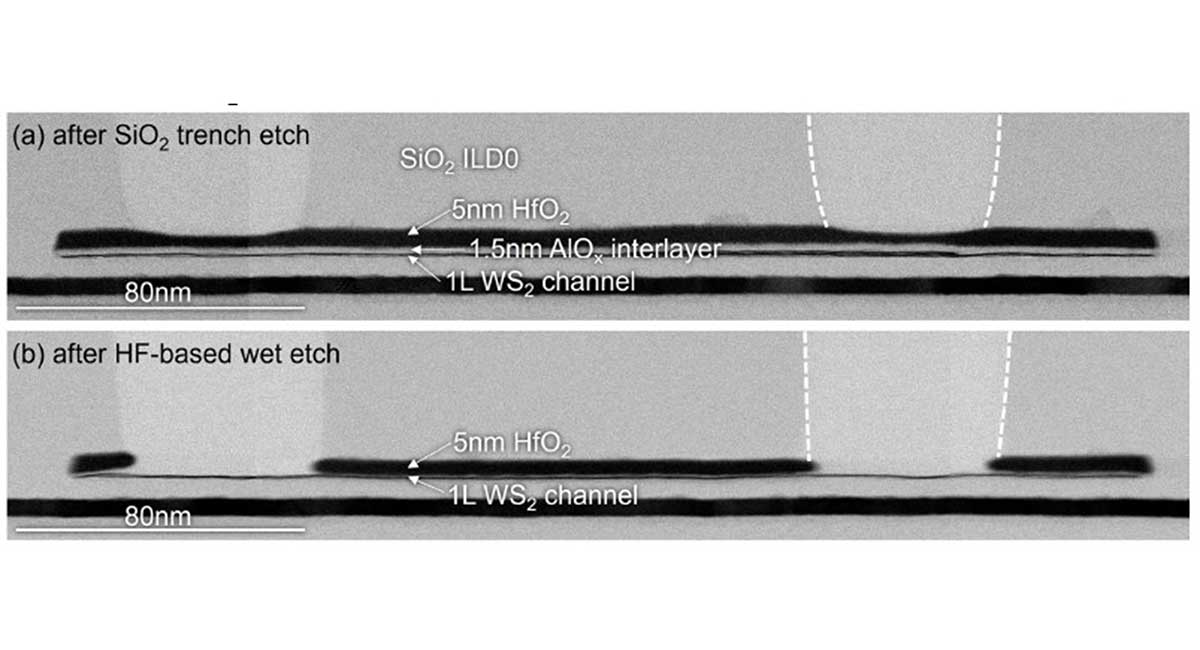 Figure 2 – (a) Trench dry etch into SiO2; (b) dry and wet etch selectively stopping on the monolayer WS2 channel, also causing AlOx interlayer lateral removal along the full channel length (in collaboration with Intel).
