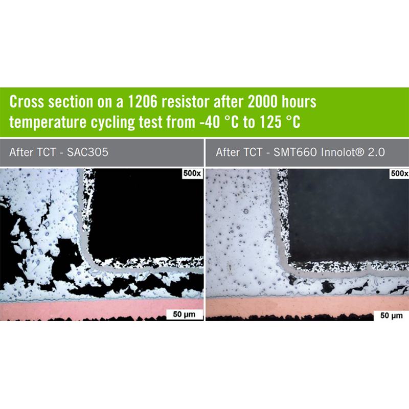 The Microbond SMT660 Innolot 2.0 solder alloy is an advanced solution which offers an innovative approach to highly reliable and cost-effective solder alloys for automotive applications. By introducing the ability to maintain a competitive Total-Cost-of-Ownership (TCO) while meeting emerging requirements, Heraeus Electronics is setting new industry benchmarks. The next generation of Innolot alloy enhances creep resistance, leading to extended product life cycles at higher operating temperatures. Notably, the Microbond SMT660 Innolot 2.0 solder paste excels in reflow without the need for additional N2, keeping defect rates low and reducing TCO.