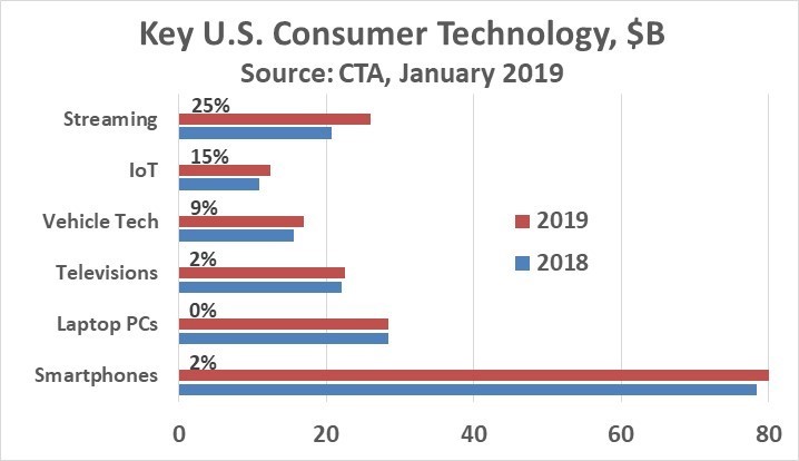 Much of the total consists of the large dollar but slow growing categories of smartphones, laptop PCs, and televisions. These three categories total $131bn in 2019 but are growing only 0% to 2%. These categories do contain some high growth products. 5G smartphones will emerge on the market later this year and are expected to account for only one percent of total smartphone units in 2019 but should account for 75% in 2022. 8K UHD televisions are also a new category in 2019 and should only account for about 200 thousand of 42 million TVs.