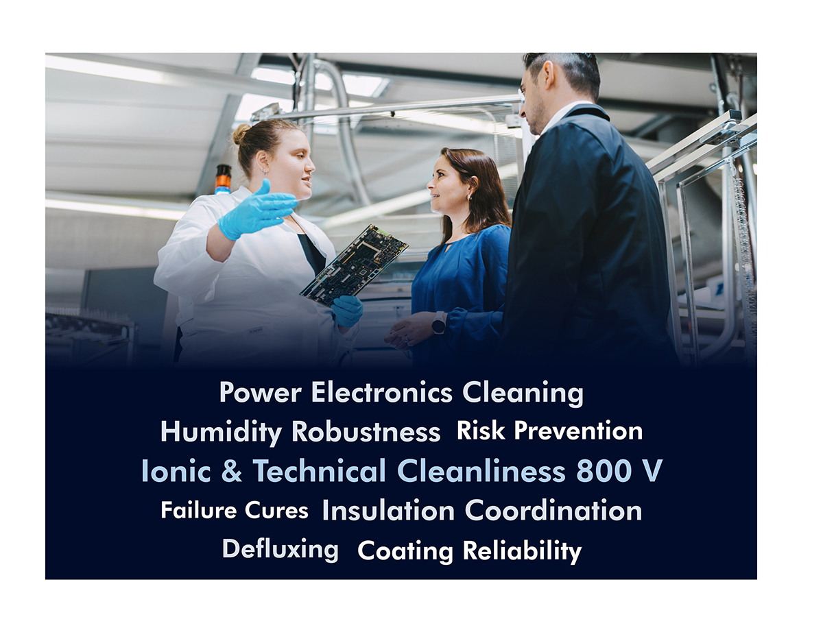 ZESTRON comprehensively supports electronics manufacturers in producing reliable electronics: by installing a cleaning process or determining the failure risk of assemblies in order to recommend concrete remedial measures. At PCIM, the expert team of engineers and technologists will advise on the topics of technical and ionic cleanliness, insulation coordination, moisture resistance and power electronics cleaning.