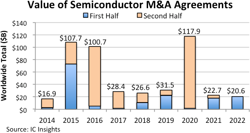 The total value of semiconductor acquisition agreements in 2022 appears to be on pace to surpass 2021’s full-year M&A value of $22.7bn.