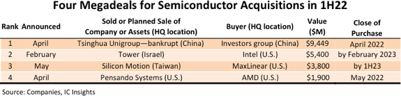 IC Insights’ list also excludes purchases of semiconductor capital equipment suppliers, material producers, chip packaging and testing companies, and design-automation software firms. Topping the M&A deals in 1H22 was an agreement by a Chinese investment consortium to take over bankrupt semiconductor conglomerate, Tsinghua Unigroup.