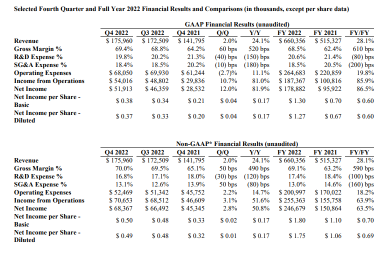 Sherri Luther, CFO, said: “In Q4 2022, revenue increased 24%, marking the eleventh consecutive quarter of sequential growth. We achieved record operating profit of 30.7% on a GAAP basis and 40.2% on a non-GAAP basis, while driving gross margin expansion of 520 basis points on a GAAP basis and 490 basis points on a non-GAAP basis compared to Q4 2021. We generated a record level of cash flow from operations, with a 42% increase compared to the prior year. In addition, since beginning our share repurchase programme nine quarters ago, we have repurchased approximately 3.6 million shares, with 290,000 shares repurchased in Q4 2022.”
