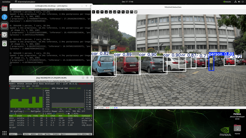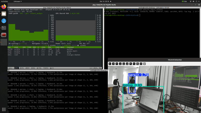 Fig 3: Screenshot Showing JTOP and Camera Preview with YOLO Object Detection Running in Real Time