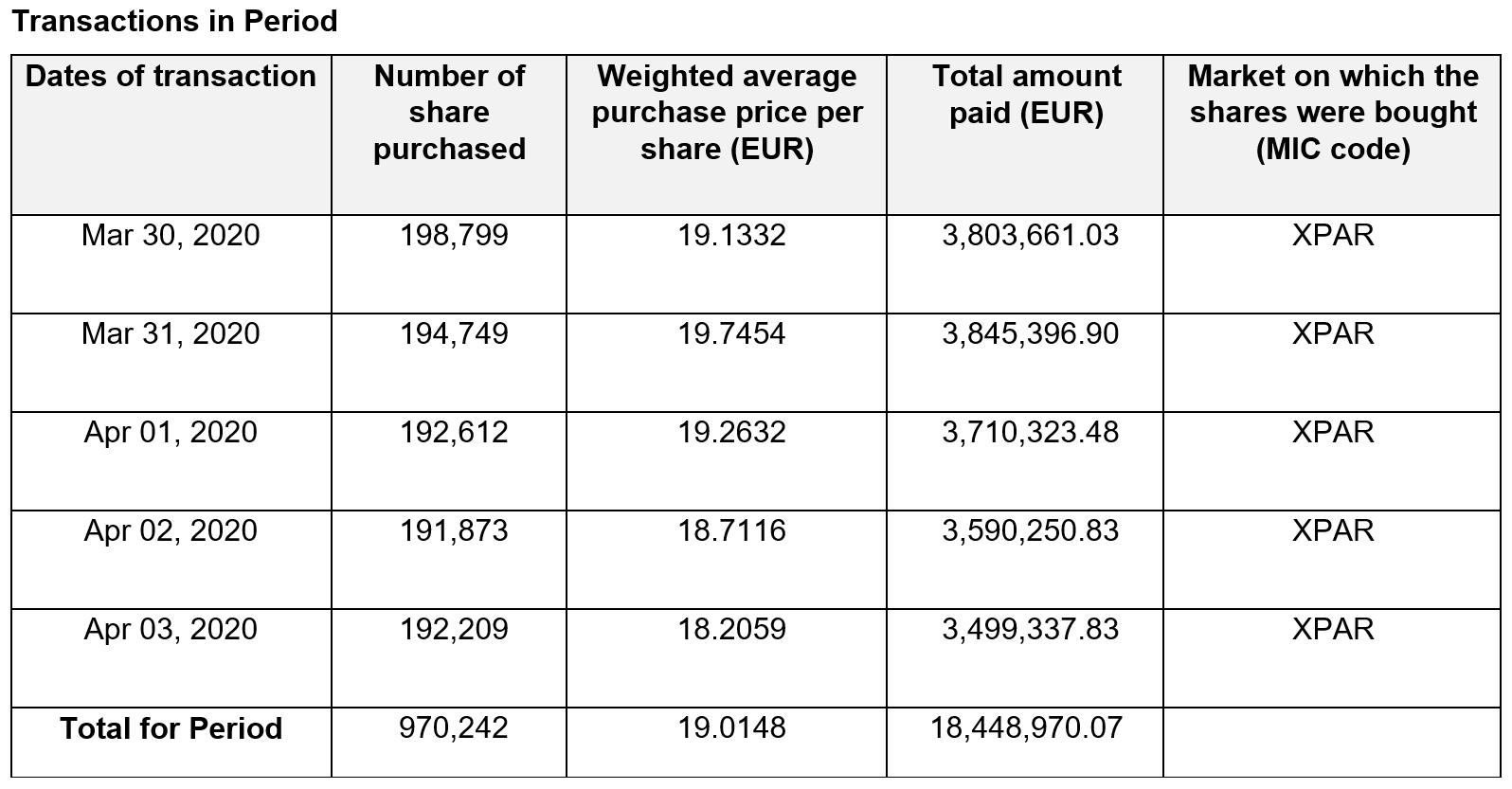 STMicroelectronics has announced the repurchase (by a broker acting for the Company) on the regulated market of Euronext Paris, in the period between March 30th, 2020 to April 3rd, 2020, of 970,242 ordinary shares (equal to 0.1% of its issued share capital) at the weighted average purchase price per share of EUR 19.0148 and for an overall price of EUR 18,448,970.07.