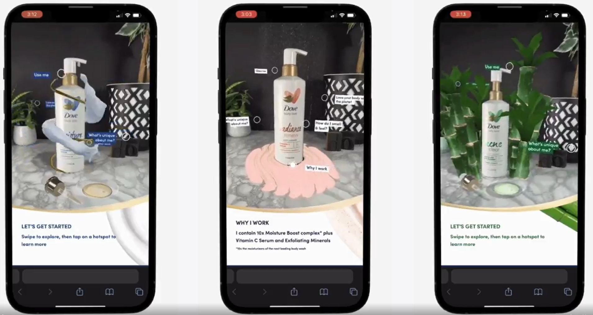Dove nailed their recent campaign focused on educating customers on the benefits of their product line. Dove used AR and 3D content to drive informed decision making, bringing three products to life. The interactive buttons educated the user on how the product can be used, desired outcomes, how the product differentiates and how it smells/looks.