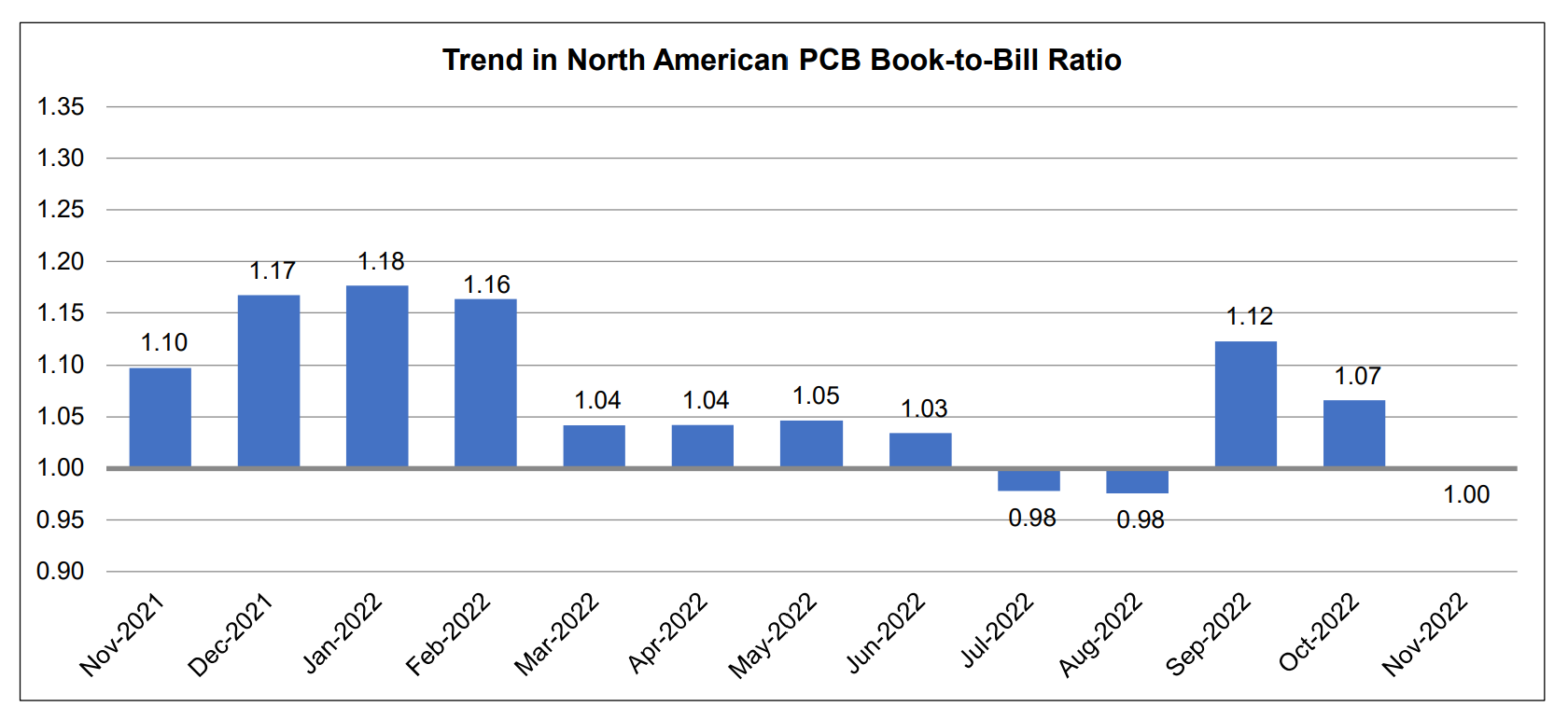 IPC’s monthly PCB industry statistics are based on data provided by a representative sample of both rigid PCB and flexible circuit manufacturers selling in the USA and Canada. IPC publishes the PCB book-to-bill ratio by the end of each month.