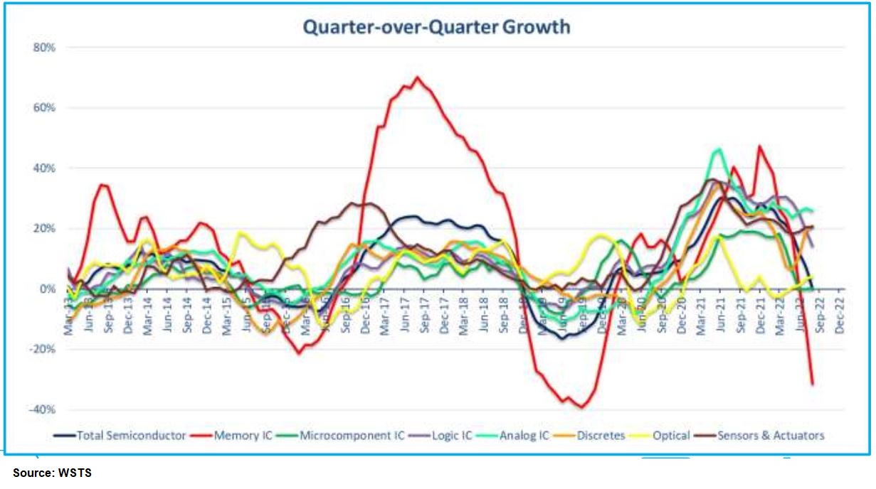 It reveals that total semiconductor market growth (the blue line) slowed to 0% in Q3’22 when compared to the previous quarter, with analogue products (the light green line) leading growth. Memory products (the leading indicator shown by the red line) continued to decline (>32%) in the quarter whilst ‘other’ semiconductor products remained positive. It is very likely however that growth across the entire semiconductor product category will enter negative territory at some point in the next two quarters.