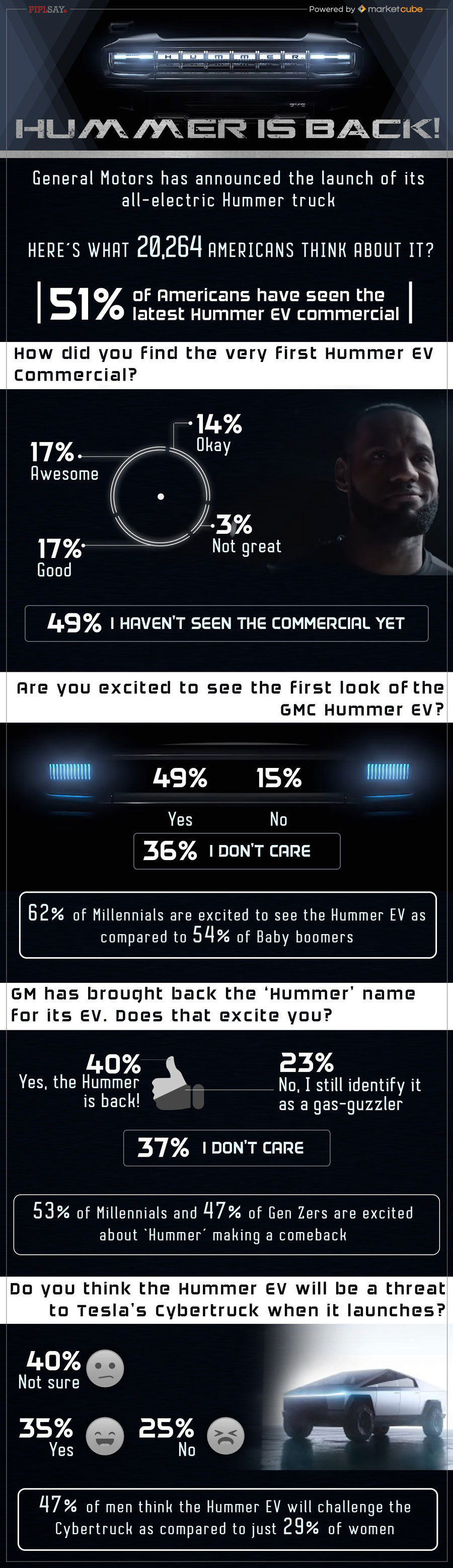 The Hummer is back in a brand new avatar. General Motors has roped in NBA star LeBron James to drive home it’s ‘all-electric’ ‘powerful’ form, and what better than the Super Bowl to make the big revelation. Piplsay polled 20,264 Americans nationwide to get the latest buzz around the Hummer’s green comeback. Here’s a summary of what Piplsay found.