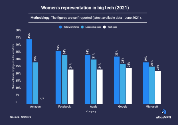 According to the data provided by Statista, as of June 2021, women made up about 47% of the US workforce. However, in top tech companies like Amazon, Facebook, Apple, Google, and Microsoft, the percentage of female employees ranged from 45% to 29%.