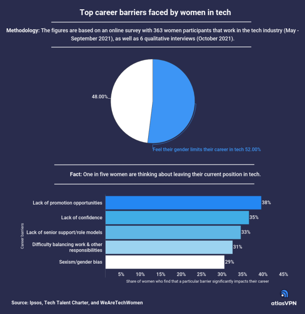 Nevertheless, women are still largely underrepresented in the tech industry and face many obstacles when pursuing a career in the field. According to data presented by Atlas VPN, 52% of women believe their gender is limiting their career in tech, and one-fifth of women are thinking about leaving their current position.