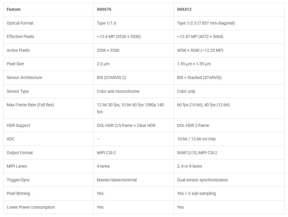 The IMX412 features a dedicated low-power mode. While IMX676 doesn’t have a Low Power Mode, it is actually quite efficient, where high-quality pixels (2.0 µm) and high dynamic range (HDR) are more important than saving a few milliwatts in a sleep state.