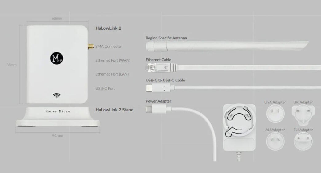 The HaLow 2 simplifies deployment and improves performance across regions worldwide, including the US, Canada, Australia, the UK, Europe, and Japan, and includes region-specific antennas and power adapters.