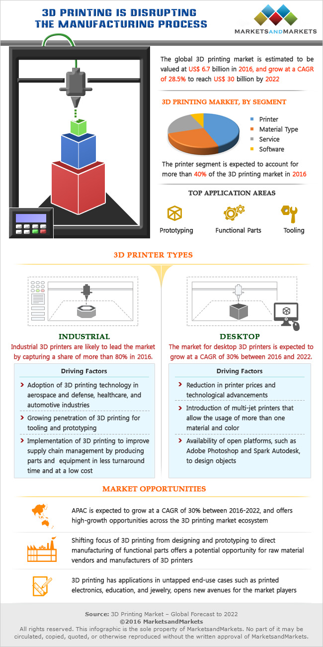 The global 3D printing market was estimated to be valued at $6.7bn in 2016, and to grow at a CAGR of 28.5% to reach $30bn by 2020.