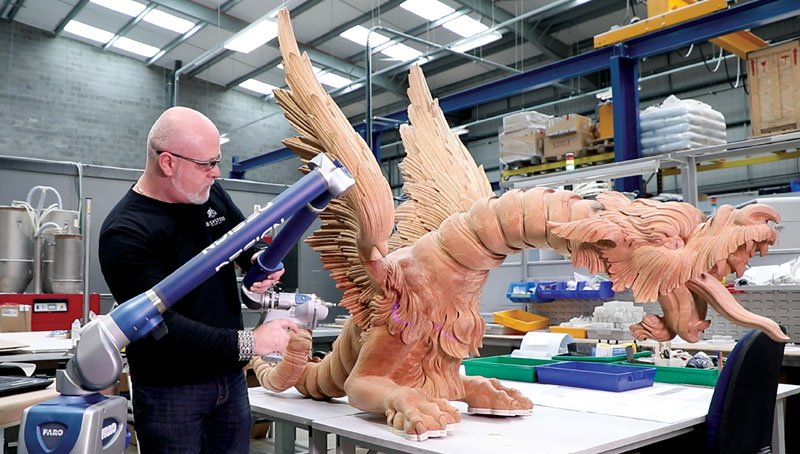 With a reverse engineering workflow and a FARO Design ScanArm, the carved wooden dragons were scanned into a 3D design environment which enabled 3D Systems from here to address the concerns of HRP regarding the weight and sustainability. By scanning the data into CAD and hollowing the scan to a controlled thickness, 3D Systems were able to preserve both exterior details but more importantly the structural integrity.