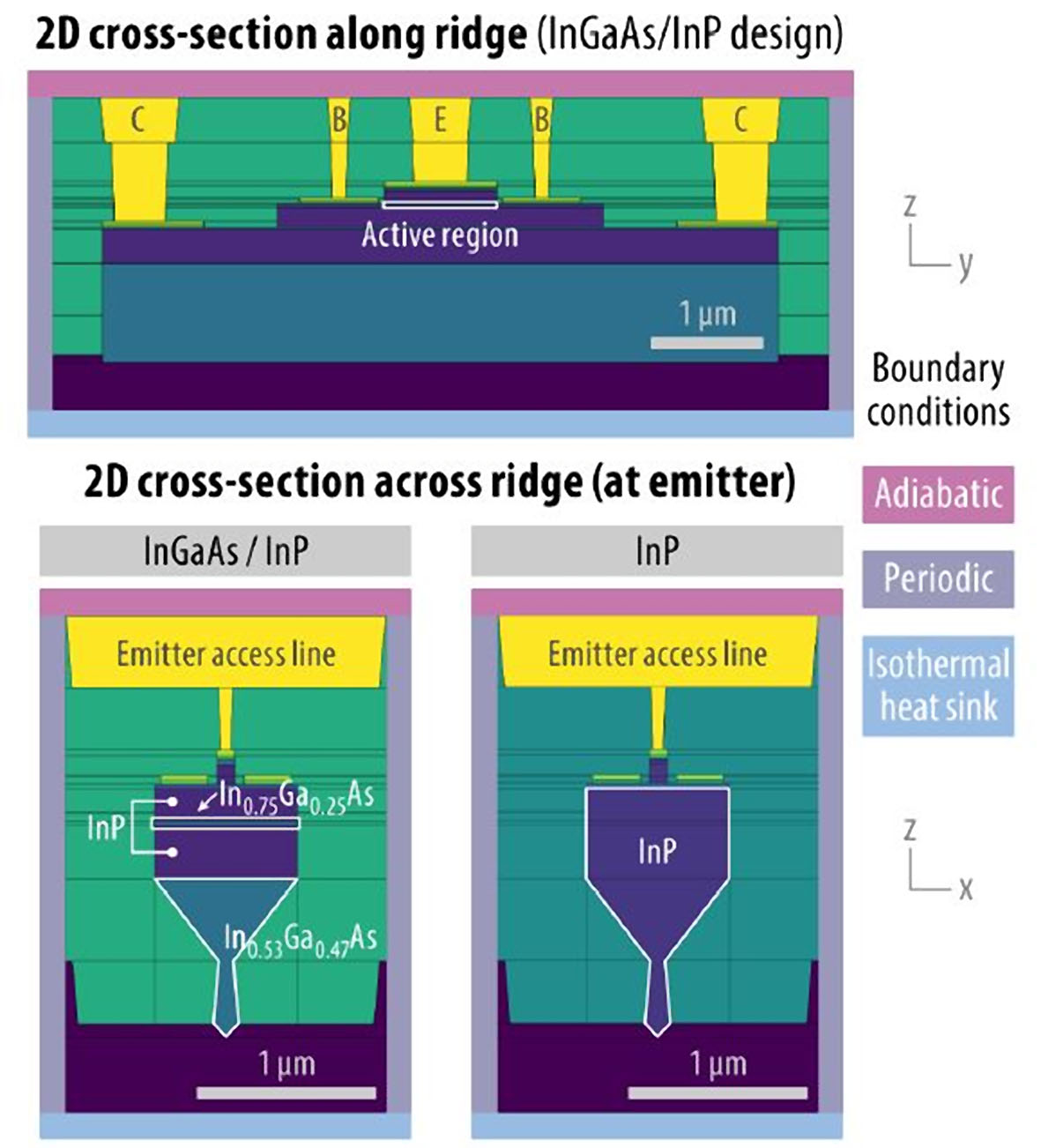 “While the tapered ridge bottoms enable low defect density within the III-V materials, they, however, induce a thermal bottleneck for heat removal towards the substrate,” explains Bjorn Vermeersch, Principal Member of Technical Staff in the Thermal Modelling and Characterisation Team at imec. “Our 3D Monte Carlo simulations of NRE InP HBTs indicate that the ridge topology raises the thermal resistance by over 20 percent compared to a hypothetical monolithic mesa of the same height. Our analyses furthermore highlight the direct impact of the ridge material (e.g., InP vs. InGaAs) on self-heating, providing an additional knob to improve the designs thermally.”