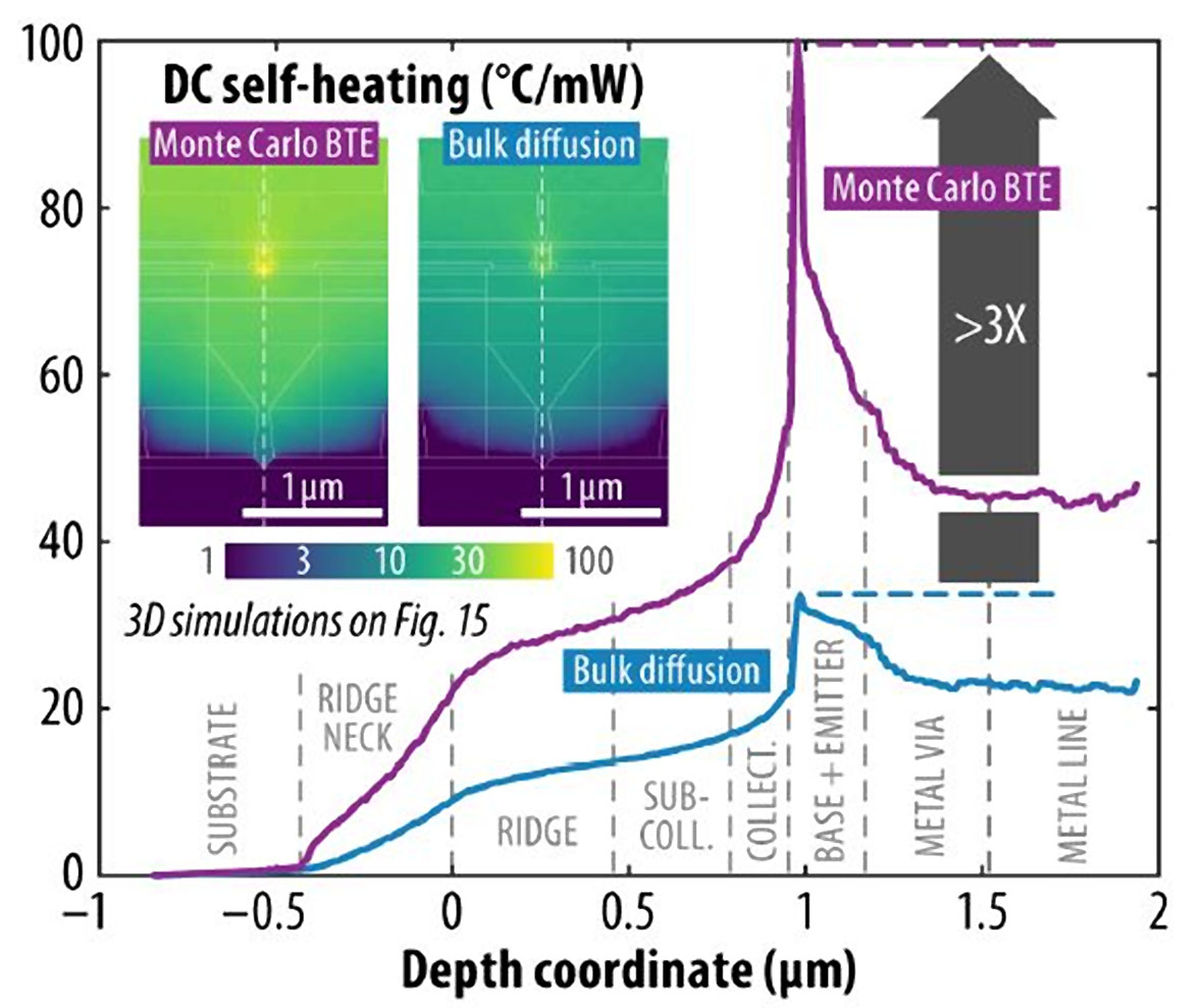 Figure 3 – Impact of non-diffusive thermal transport effects (as captured by imec’s Monte Carlo simulation) in InP nanoridge HBTs