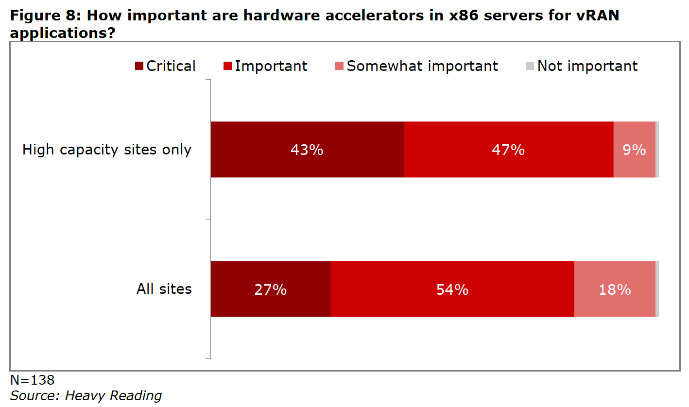 “Hardware accelerators are used to improve Layer 1 performance in vRAN because x86 processors do not currently match dedicated baseband processing hardware. This is particularly acute where higher order multiple input, multiple output (MIMO) and massive MIMO configurations are used (as they increasingly are)…a large majority think hardware accelerators are ‘critical’ or ‘important.'”
