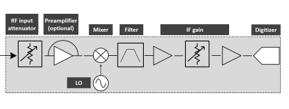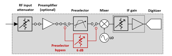 By default, in the signal analyser’s standard signal path, the input travels through the RF attenuator, preamplifier, and preselector before reaching the mixer. This signal path is ideal for measuring low-level signals that have a bandwidth of less than 45 MHz.