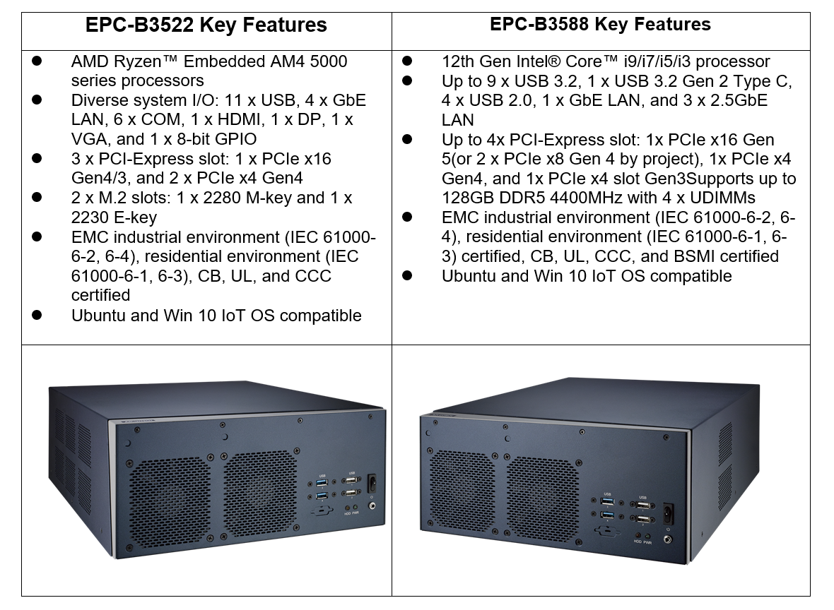 Comprising the EPC-B3522 with AMD Ryzen AM4 5000 and the EPC-B3588 with 12th Gen Intel Core, this series supports NVIDIA Quadro level GPU cards and up to 4 × full height PCIe cards.