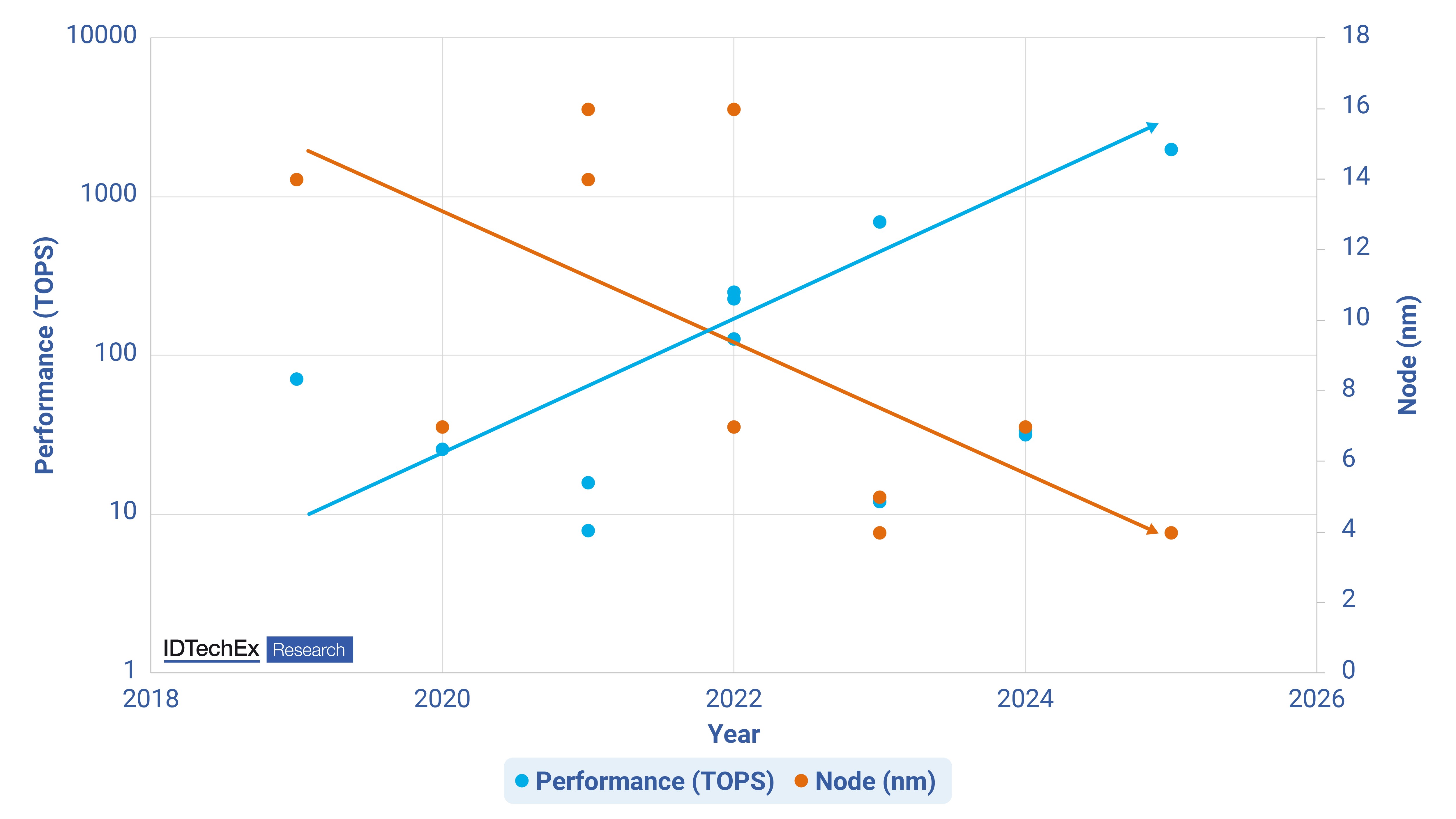 The trends for automotive SoCs is for performance to increase with each year while node process moves toward the most leading edge. Source: IDTechEx