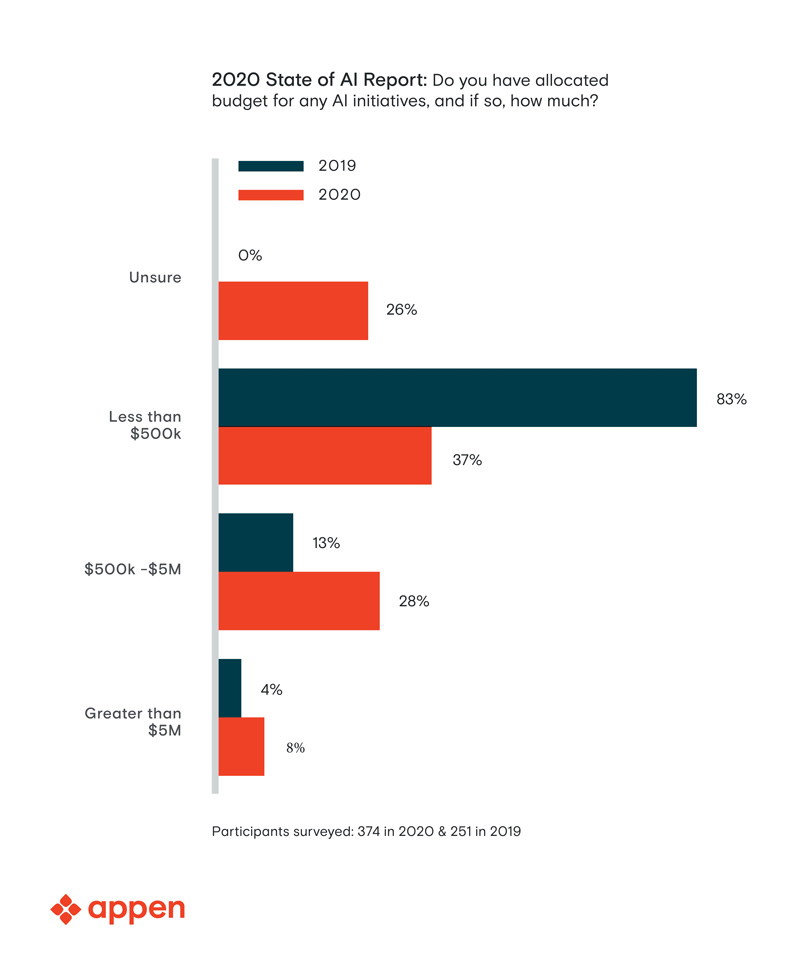 According to the report, nearly 75% of businesses now consider AI critical to their success, and AI continues to grow in importance across companies of various sizes and industries. Yet, almost 50% of those who responded to the 2020 State of AI survey feel their company is behind on their AI journey, suggesting a critical gap exists between the strategic need and the ability to execute.