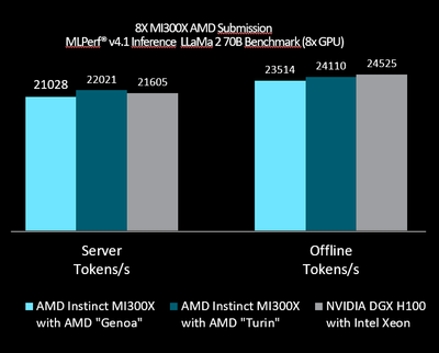 - Submission ID 4.1-0002: Featuring a configuration of 8x AMD Instinct MI300X accelerators paired with 2x AMD EPYC 9374F (Genoa) CPUs in the Available category.