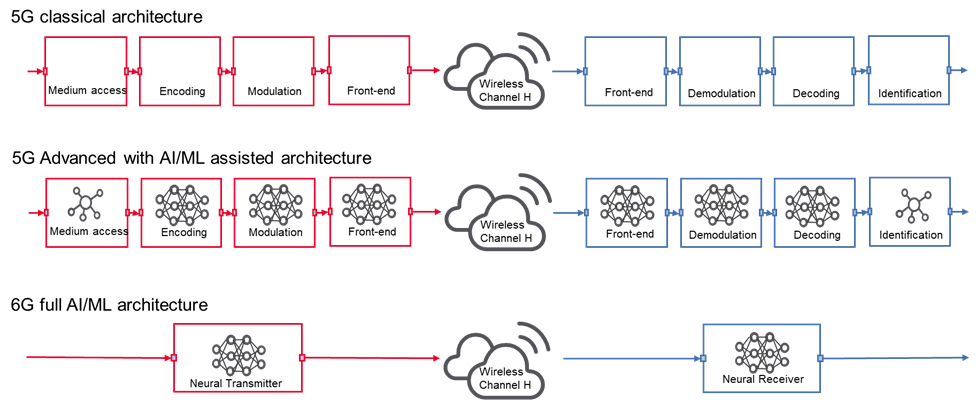 AI-native networks can also mean networks that were built to natively run AI/ML models. Consider the design flow in Figure 3. In traditional 5G networks, the air interface is made up of different processing blocks, each designed by humans. In 5G Advanced, each block will leverage ML to optimise a specific function. In 6G, it’s possible that AI will design the entire air interface using deep neural networks.