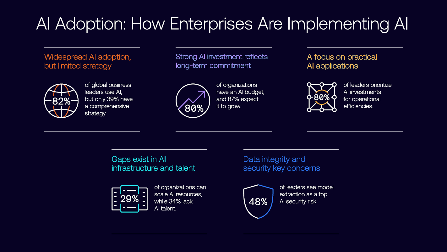 - Widespread adoption, but limited strategy: the survey found 82% of global business leaders are currently using AI applications, yet despite this widespread adoption, only 39% report having a clearly defined, comprehensive strategy in place