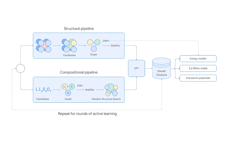 GNoME employs two distinct pipelines to identify low-energy (stable) materials. The first, known as the structural pipeline, generates candidate materials with structures analogous to already known crystals. The second, the compositional pipeline, adopts a more randomised method, focusing on chemical formulas to create potential materials. The outputs from both pipelines are then rigorously assessed using established Density Functional Theory (DFT) calculations. These results are subsequently integrated into the GNoME database. This process of evaluation and integration plays a crucial role in informing subsequent cycles of active learning within GNoME, continually enhancing the tool’s effectiveness in discovering stable materials.