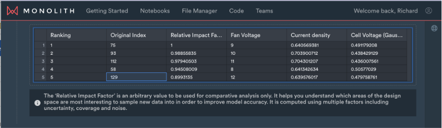 Fig 1. The Monolith Next Test Recommender system recommended the last test – number 129 – should actually be among the first 5 to run and that 60 tests are sufficient to characterise the full performance of the fan, a 53% reduction in testing.