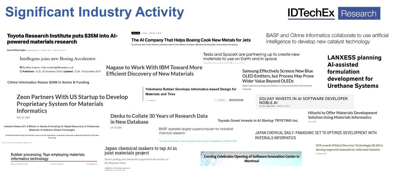 Image depicting some of the big news stories in Materials Informatics. This includes many notable companies and a significant proportion based in Japan. Most of the news is associated with “accelerating materials R&D”. For more information see the IDTechEx report, ‘Materials Informatics 2020-2030‘.