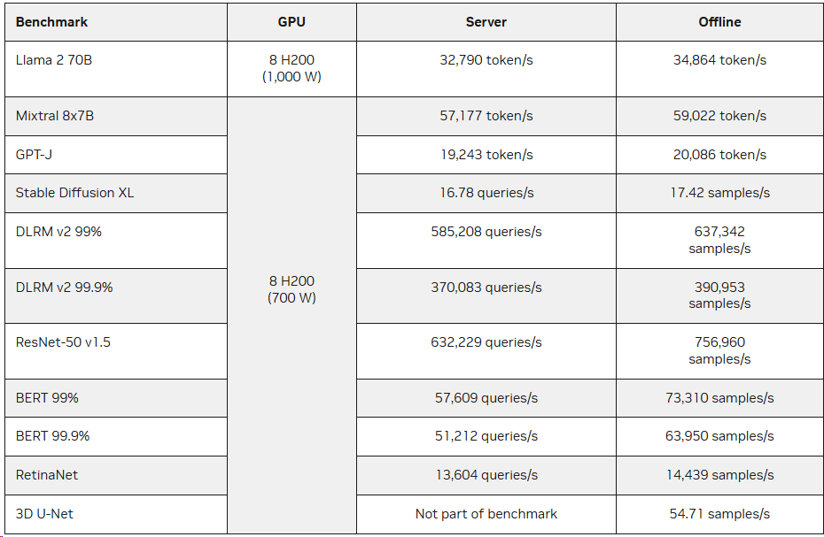 Table 2. NVIDIA MLPerf Inference v4.1 data center results using H200 GPUs. Llama 2 70B results based on H200 configured at 1000W, all other results using H200 at 700W