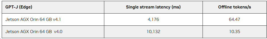 Table 3. GPT-J LLM performance in the MLPerf Inference; Edge (v4.0 and v4.1) on Jetson AGX Orin
